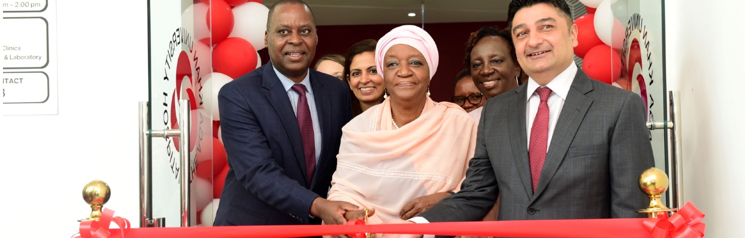 </span></p><p><span style="font-family: helvetica;"><em>High Commissioner of the Republic of Rwanda H.E. Ernest Rwamucyo, Director-General of the United Nations Offices, Nairobi, Zainab Bangura & Aga Khan University Hospital CEO Rashid Khalani during the opening of the Gigiri Specialty and Executive Clinic at Oasis Mall along Limuru Road. Looking on are Aga Khan University Hospital Head of Outreach Health Network Dr. Jyoti Bhayani & Director Marketing and Partnerships, Pauline Ngatia.</em>